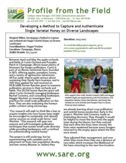 Between April and May the apple orchards and fields at Curtis Orchard and Pumpkin Patch in Champaign, Illinois boast plenty of blossoms for hungry pollinators. Curtis is part of an Illinois centennial farm, founded in 1873, offering apples, pumpkins, honey, and a variety of agritourism adventures. All fun aside, they’re quite serious about sustaining their family farm business, and in 2015 they applied for and received an NCR-SARE Farmer Rancher grant to examine pollination services in their orchards and fields. The $11,734 Farmer Rancher grant will allow Curtis Orchard’s managing beekeeper, Rachel Coventry, and consulting beekeeper, Maggie Wachter, to investigate best practices for small-scale pollination on the farm. They are also evaluating the honey’s pollen content using microscopy.