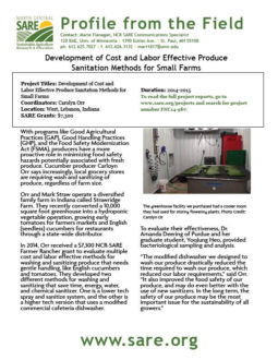 In 2014, Orr received a $7,300 NCR-SARE Farmer Rancher grant to evaluate multiple cost and labor effective methods for washing and sanitizing produce that needs gentle handling, like English cucumbers and tomatoes. They developed two different methods for washing and sanitizing that save time, energy, water, and chemical sanitizer. One is a lower tech spray and sanitize system, and the other is a higher tech version that uses a modified commercial cafeteria dishwasher.