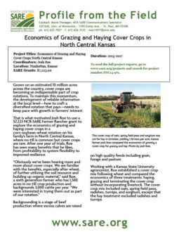 That is what motivated Josh Roe to use a $7,223 NCR-SARE Farmer Rancher grant to explore the economics of grazing and haying cover crops in a corn-soybean-wheat rotation on his family’s farm in North Central Kansas, where no-till is common but cover crops are rare. After one year of trials, Roe has seen many benefits that he likes, from profitability to system flexibility to improved resilience.