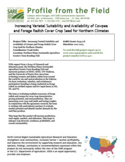With support from a $199,776 Research and Education grant, the Northern Plains Sustainable Agriculture Society Farm Breeding Club and university partners at NDSU, SDSU, UW-Madison, and the University of Puerto Rico, have been evaluating cowpeas and daikon radish from around the world for use and seed production in the Dakotas. On-farm evaluation, selection, and evolutionary participatory breeding is being conducted on forage radish on certified organic and low-input farms in ND, SD, and WI.