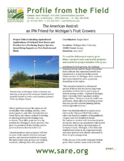 With a $9,959 NCR-SARE Graduate Student grant, Shave and her team worked directly with eleven cherry growers in Leelanau County to explore the effectiveness of habitat enhancement for kestrels. They installed 25 new nest boxes and monitored kestrel and prey abundances. They tracked kestrel and orchard pest behavior with a variety of technologies including weatherproof cameras with night vision and GPS data loggers. The kestrels provisioned their young with a variety of orchard pests, including grasshoppers, voles, and fruit-eating birds. Although the kestrels did not bring birds to their nests as frequently as small mammal and insect prey, Shave found that fruit-eating birds were less abundant in orchards with active kestrel boxes, perhaps because they were deterred by the presence of kestrels. All of this was good news for growers.
