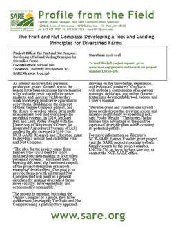 As interest in diversified perennial production grows, farmers across the region have been searching for sustainable ways to battle pests, tap into lucrative markets, and increase yields as they work to develop biodiverse agricultural ecosystems. Building on the concept of their Veggie Compass project, and the desire to develop whole farm profit management tools and workshops for perennial systems, in 2016, Michael Bell and Leah Potter-Weight with the University of Wisconsin’s Center for Integrated Agricultural Systems (CIAS) applied for and received a $199,246 NCR-SARE Research and Education grant to develop a similar tool called the Fruit and Nut Compass.