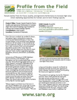 University of Wisconsin (UW)-Madison plant scientist, Julie Dawson, says tomatoes can be a potentially high-return crop for diversified vegetable farmers. In 2014, Dawson received a $199,866 NCR-SARE Research and Education grant to work with graduate student Kitt Healy to conduct organic and low-input field trials investigating tomato varieties for optimal economic and environmental sustainability on two research stations and six farms. She wants to be able to recommend tomato varieties that have both disease resistance and superior flavor for direct sale to high-value markets in the North Central region.