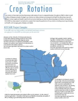 Crop rotation is the ancient practice of growing a wide variety of crops in a sequential system throughout a field in order to avoid a buildup of disease and pests. Strategic crop rotations can help producers promote good soil health by alternating crops with different nutrient needs and benefit overall soil structure by breaking up subsoil by alternating deep and shallow rooting plants. NCR-SARE supports research and education projects that study the applications of crop rotation-including improving soil quality and health, and managing pests, diseases, and weeds.