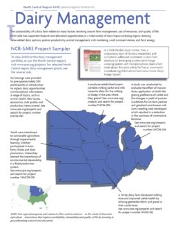 The sustainability of a dairy farm relates to many factors revolving around farm management, use of resources, and quality of life. NCR-SARE has supported research and education opportunities in a wide variety of dairy topics including organic dairying, value-added dairy options, pasture productivity, animal management, milk marketing, small ruminant dairies, and farm energy.