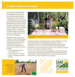 The North Central Region SARE (NCR-SARE) Graduate Student Grant Program supports projects by graduate students that address sustainable agriculture issues and are part of the student’s degree program. NCR-SARE instituted the Graduate Student Grant Program in 2002 for officially registered graduate students (Masters and Ph.D.) enrolled at accredited colleges or universities. Projects must benefit agriculture in the North Central Region.