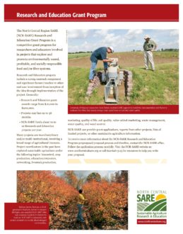 The North Central Region SARE (NCR-SARE) Research and Education Grant Program is a competitive grant program for researchers and educators involved in projects that explore and promote environmentally sound, profitable, and socially responsible food and/or fiber systems. Research and Education projects include a strong outreach component and significant farmer/rancher or other end-user involvement from inception of the idea through implementation of the project.