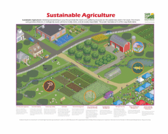 This poster depicts the elements of sustainable agriculture in a visual format easy for younger audiences to understand.