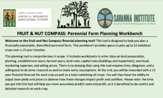 “The Fruit and Nut Compass enables a person to examine the complete costs and expected returns of up to 12 crops simultaneously, as part of an integrated farm plan over 15 years,” explained the developers. “The tool is designed as an ‘open workbench’ where users enter information based on specific plans to assess whether their enterprise will be profitable. It does NOT include any assumptions about crops, yields, costs, or selling prices…those are all data entry tasks for the user. The main questions this tool helps the user answer are: how deep of a financial hole will I be digging, and when might my perennial crop farm become profitable?”